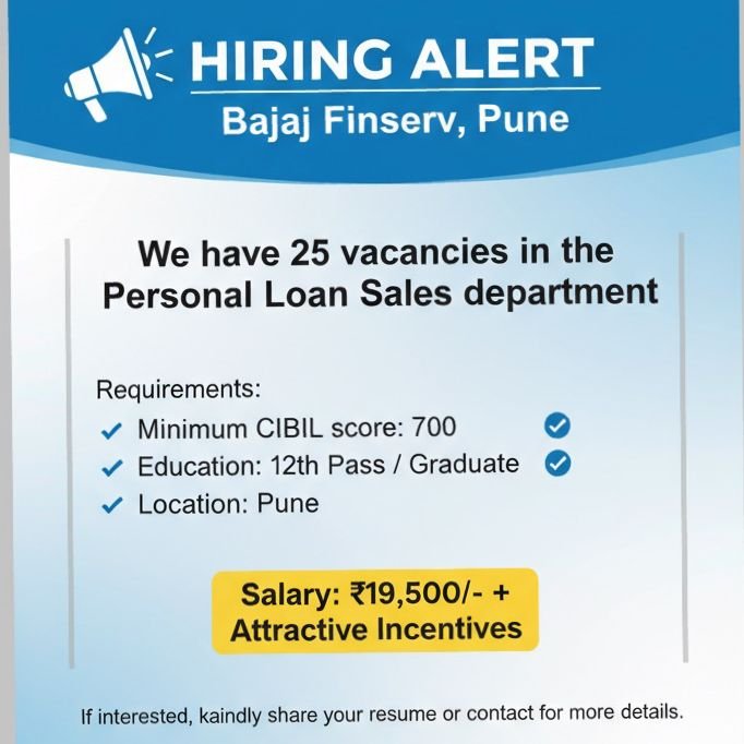 पद: पर्सनल लोन सेल्स विभागएकूण रिक्त पदे: 25 अर्हता: पगार: ₹19,500/- + आकर्षक इन्सेंटिव्ह आपल्या करिअरची उत्तम सुरुवात बजाज फिनसर्वसोबत करा!उत्साही आणि मेहनती उमेदवारांनी ...